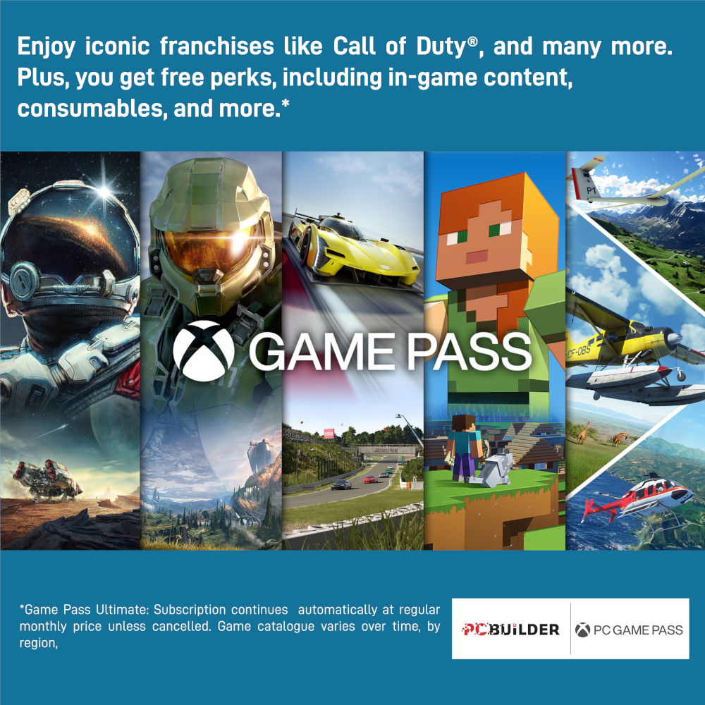 The PCBuilder SCOUT Windows 11 Gaming PC also includes one month of PC Game Pass including EA Play. Play over 100 high-quality PC games, in various genres such as Halo Infinite, Forza Horizon 5, and Minecraft on your new gaming rig. With new games added all the time, there’s always something new to play from day one.